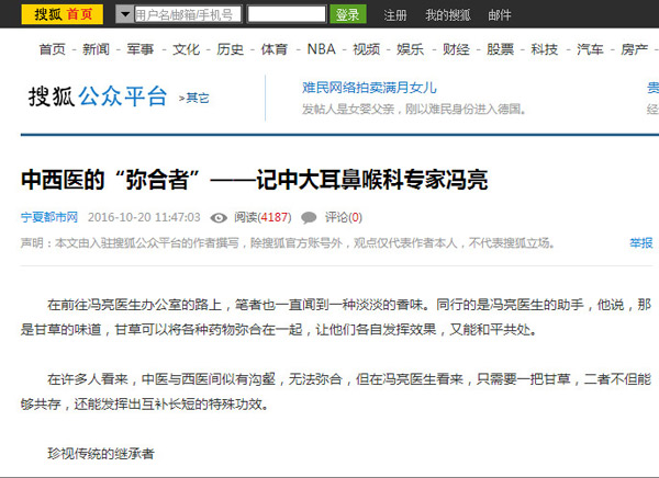 (摘自《搜狐新闻》)在前往冯亮医生办公室的路上,笔者也一直闻到一种淡淡的香味。同行的是冯亮医生的助手,他说,那是甘草的味道,甘草可以将各种药物弥合在一起,让他们各自发挥效果,又能和平共处。